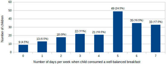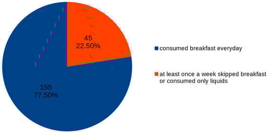 According to the fully completed diaries, more than ¾ of the participants consumed breakfast every day. However, 45 children (22.5%) admitted that they did not consume solid food for breakfast at least once a week, including nine children who skipped breakfast at least once a week (Figure 1). We observed no difference between everyday breakfast consumption and the child’s sex or age (Table 2).