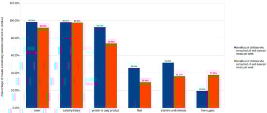Analysis of 1383 observations showed that, in total, more than 92% of analyzed meals contained a source of carbohydrates and more than 80% a source of protein or a dairy product. Differences in breakfast composition and the content of nutrients in a group of children who usually consume well-balanced meals and those who consume well-balanced meals less frequently are presented in Figure 3.