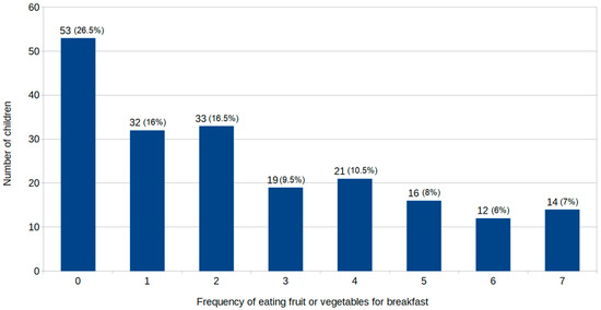 In Poland, the National Food and Nutrition Institute recommends that vegetables and fruit dominate the diet of adults and children and should constitute half of what is eaten. It is advised to eat a variety of vegetables and fruits as often and as much as possible, with the proportion of more vegetables than fruit, preferably by including a portion of a fruit or vegetable in every meal [21,22]. Therefore, we assessed how often children eat breakfast that is accompanied by fruit or vegetables. Only 7% consumed fruit or vegetables for breakfast every day, and 26.5% never eat fruit or vegetables for breakfast (Figure 4).