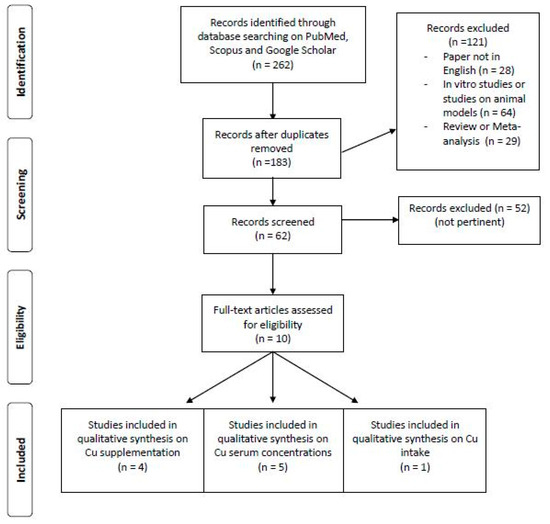 - Analysis and presentation of the outcomes: paragraphs about effectiveness of copper supplementation alone or in combination with other nutrients were created, and the data extrapolated from the “revised studies” were collocated in tables; in particular, the author, year of publication, and the characteristics of the study were specified for each study.