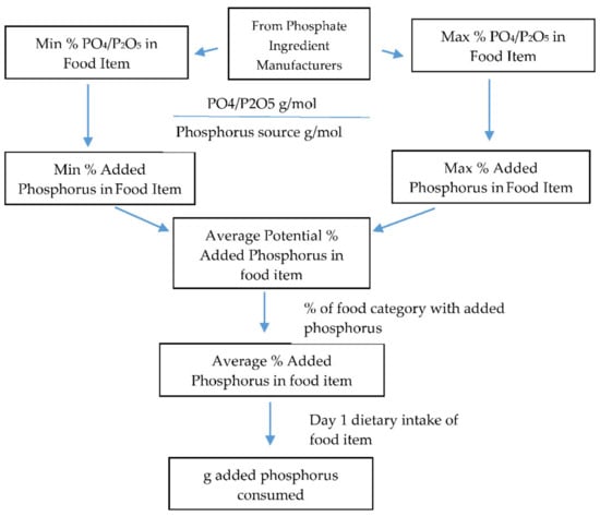Steps used to calculate estimated added phosphorus in food categories are displayed in Figure 1. Information was collected on phosphorus source ingredients and range of levels present in food categories from phosphate ingredient manufacturers (see Supplementary Materials Table S1). The minimum and maximum levels of PO4 and P2O5 were multiplied by their respective molecular weights to obtain the phosphorus weight, and then these weights were averaged for each food category (155). Averages were used since differences between minimum and maximum levels were small, with the largest difference being 0.7% added phosphorus as P2O5 within food categories white potatoes (baked, boiled, or mashed potatoes) and white potato mixtures. Then, these values were multiplied by the percentage of products in a food category with phosphorus ingredients as determined by an analysis of Innova Market Insights database (see Supplementary Materials Table S2) that contains information on ingredients in foods, to obtain the average percentage of added phosphorus in the food category. Natural phosphorus content was determined by subtracting the calculated added phosphorus from the total phosphorus content provided in the NHANES. Total, natural, and added phosphorus intakes were determined by multiplying the percentage of respective phosphorus in the food item by the Day 1 dietary intake of the food. Summation of total, natural, and added phosphorus from all individual food categories resulted in daily total intake.
