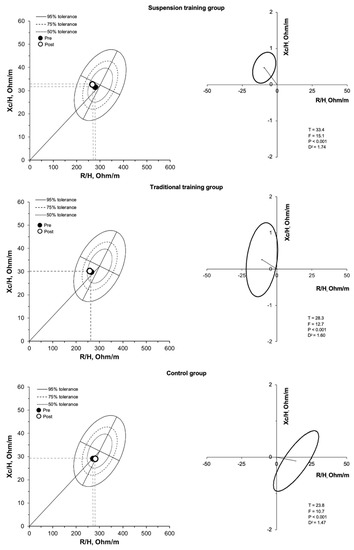 The impedance measurements were performed with a bioimpedance analyzer (BIA 101 Anniversary, Akern, Florence, Italy) at a frequency of 50 kHz. The accuracy of the BIA instrument was validated before each test session following the manufacturer’s instructions. The participants were assessed in the supine position with legs (45° compared to the median line of the body) and arms (30° from the trunk) abducted. After cleansing the skin with alcohol, two electrodes were placed on the right hand and two on the right foot. Bioimpedance values were analyzed according to classic and specific BIVA methods [11,13,37,38]. As proposed by Piccoli et al. [11], bioelectrical variables can be analyzed in relation to the distribution of the reference population (through tolerance ellipses). Mean vectors can be compared among groups by means of 95% confidence ellipses. Mean vectors can also correspond to differences between paired observations (in this case, post minus pre training values) and projected as confidence ellipses on the paired R-Xc graph sheet. Body composition parameters were estimated using specific bioimpedance-derived equations [39,40,41] as follows: