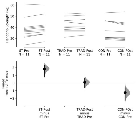 Handgrip strength increased and decreased in the suspension training and control groups, respectively, and remained stable in the traditional training group (Table 1 and Figure 5).
