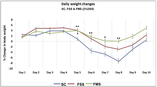 Percentage of weight change associated with acute DSS in mice receiving standard chow (SC) and chow supplemented with ferrous sulphate (FSS) or ferric maltol (FMS). Data are presented as a mean ± standard error of the mean. Statistical differences were assessed by Kruskal–Wallis test followed by Dunn’s multiple comparison tests (* p < 0.05, ** p < 0.01). (n = 40 ♀ mice) (asterisks above FMS vs. SC, asterisk below FSS vs. SC).
