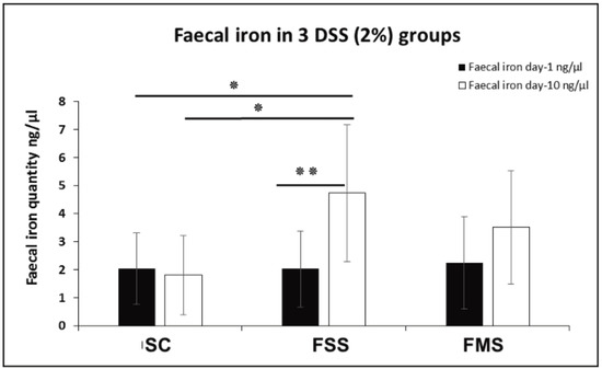 Faecal iron concentration at two different time points (day 1 and 10) for three DSS-treated groups of mice (SC, FSS and FMS diets). Data are presented as a mean ± standard error of the mean. Differences were tested by t-test (inter-comparison) and by one-way ANOVA (intra-comparison) followed by post hoc test. (* p < 0.05, ** p < 0.01).