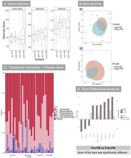 For the bioinformatic analysis of microbiota data, the relative abundance of phyla before and after supplementation in each group was reported. OTUs were filtered at a 0.05% abundance threshold [20]. Alignment and phylogeny analyses were carried out on MacQIIME (v1.9.1) [21] with default algorithms (PyNAST [22] and FastTree2 [23]). Microbial data were analysed with R (version 3.6.3) [24] using scripts created by the authors [25]. The Vegan package [26] was used for alpha and beta diversity analysis. For beta diversity, distance measures (Bray-Curtis, unweighted and weighted UniFrac [27] were calculated using Phyloseq [28]. Principal Coordinates Analysis (PCoA) were used to visualize beta-diversity cluster analysis. Permutational multivariate analysis of variance (PERMANOVA) of sources of variations (groups in this study) against the distance matrices as mentioned above were performed with Vegan’s adonis function (permutations = 999). Pair-wise ANOVA was calculated with aov [29]. DESeq2 was used (DESeqDataSetFromMatrix) using default parameters, to carry out taxa differential analysis, results with a significance value cut-off of 0.05, adjusted for multiple comparisons, and fold-change of at least 2 were kept. Within taxa, differential analysis, to rank in terms of importance of each significant taxa, a random forest classifier was used; the random Forest function [30] was used to make this calculation. The importance function was used to extract Mean Decreased Accuracy (MDA) and Mean Decreased Gini (MDG).
