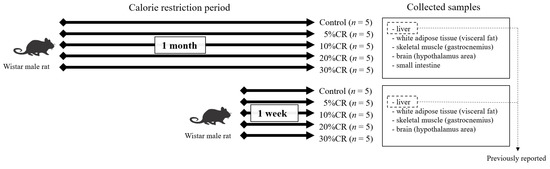 The methods used in the animal experiment have been described previously [8]. Male Wistar rats purchased at 5 weeks of age from Japan SLC (Tokyo, Japan) were kept individually and fed the American Institute of Nutrition-93G powdered diet ad libitum for 1 week or 1 month. The daily intakes of these two groups were recorded, and then 100%, 95%, 90%, 80%, and 70% of their daily intakes were provided to five groups (control, 5, 10, 20, and 30% CR, respectively) of five rats each for 1 week or 1 month. (Figure 1). The rats were anesthetized with diethyl ether on the last day of the experiment, after an overnight (16 h) fast and their white adipose tissue (visceral fat), skeletal muscle (gastrocnemius), brain (hypothalamus area), small intestine (collected only after 1 month), and liver (data reported previously) were collected. All procedures were done according to the Animal Usage Committee of the Faculty of Agriculture at the University of Tokyo’s regulations, and the committee’s consent was acquired (permission number 1818T0011).