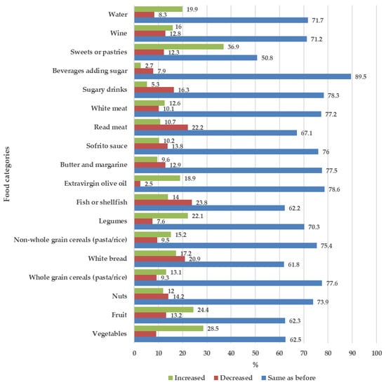 To evaluate the effect of the lockdown on Italian food habits, changes in the consumption of typical Mediterranean Diet food were asked, and the results were reported in Figure 1. For several items, the dietary changes during the confinement led to a consumption pattern more in line with the Mediterranean Diet principles, given the increase in the consumption of vegetables (28.5%), fruit (24.4%), water (19.9%), legumes (22.1%), olive oil (18.9%), nuts (12%), whole grain cereals (13.1%), and fish or shellfish (14%). Other elements in line with the Mediterranean Diet principles were the reduction in consumption of red meat (22.2%), sugary drinks (16.3%), and butter and margarine (12.9%). The confinement period was also characterized by changes in consumption patterns that worsened the dietary profile of the respondents. In fact, the intake of sweets and pastries (36.9%) and wine (16%) increased. In addition, although a small percentage of respondents increased their fish and shellfish consumption, almost a quarter (23.8%) reduced the intake of these foods.