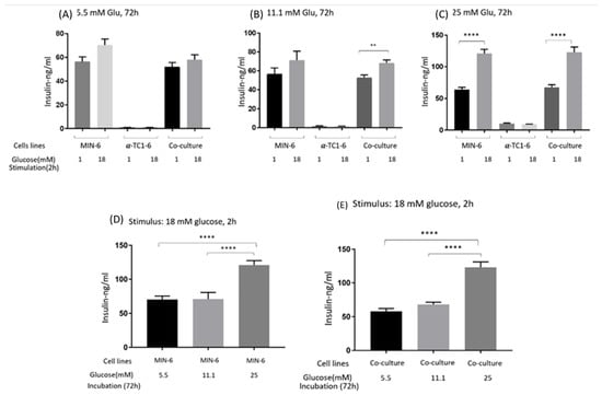 Insulin secretion from mono- or co-cultured MIN-6 and α-TC1-6 cells when stimulated with low (1 mM) or high (18 mM) glucose after 72 h incubation in (A) 5.5, (B) 11.1, or (C) 25 mM glucose, respectively. (D) Insulin secretion from MIN-6 cells when stimulated with high glucose after 72 h incubation in 5.5, 11.1, or 25 mM glucose, respectively. (E) Insulin secretion from co-cultured cells when stimulated with high glucose after 72 h incubation in 5.5, 11.1, or 25 mM glucose, respectively. Data are presented as the mean ± SEM of 18 samples per condition from three independent experiments. ** p < 0.01, **** p < 0.0001.