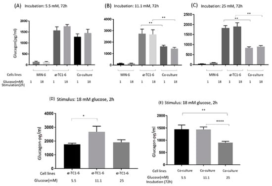 Glucagon secretion from mono- or co-cultured MIN-6 and α-TC1-6 cells when stimulated with low (1mM) or high (18 mM) glucose after 72 h incubation in (A) 5.5, (B) 11.1, or (C) 25 mM. (D) Glucagon secretion from α-TC1-6 cells when stimulated with high glucose after 72 h incubation in 5.5 mM, 11.1, or 25 mM glucose. (E) Glucagon secretion from co-cultured cells when stimulated with high (18 mM) glucose after 72h incubation in 5.5, 11.1, or 25 mM glucose. Data are presented as the mean ± SEM of 18 samples per condition from three independent experiments. * p < 0.05, ** p < 0.01, **** p < 0.0001.