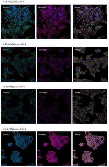Brereton et al. co-cultured MIN-6 and α-TC1-6 cells (3:1) for 6–8 days on gelatin-coated tissue culture flasks and observed the formation of three-dimensional islet-like clusters, i.e., the majority of α-TC1-6 cells were located in the periphery of the pseudo islets, while the MIN-6 cells formed in the core of the structure []. More recently, Kim et al. reported that co-cultured β TC-1 and α TC-6 cells (with the ratio of 1:1) formed aggregates while incubated in a gyratory shaker. In their system, α TC-6 became compact and spherical and β TC-1 cells did not show a specific pattern after 72 h incubation []. In this study, we mixed MIN-6 and α-TC1-6 cells at the ratio of 3:1 and maintained them in non-treated 24-well plates for 3 days. From both morphology (Figure S1) and immunostaining images (Figure 3), no islet-like cell clusters were observed. Early studies reported the formation of islet-like aggregates with or without shaking in a non-treated dish. However, Matta and team demonstrated that the rotational culture is more appropriate for pancreatic cells to reaggregate than the static culture [,]. Recently, Singh et al. found that sulfonylureas exert two opposite actions on glucagon secretion, i.e., a direct stimulation as in β cells, and an indirect inhibition via somatostatin signaling []. This corroborates the findings of Vergari et al. [], showing that the therapeutic concentrations of insulin inhibit glucagon by an indirect (paracrine) mechanism mediated by intra-islet somatostatin release. However, the present study suggests other signal pathways independent of δ cells for insulin to suppress glucagon secretion. Unfortunately, we do not have data that point to specific alternative mechanisms of actions.