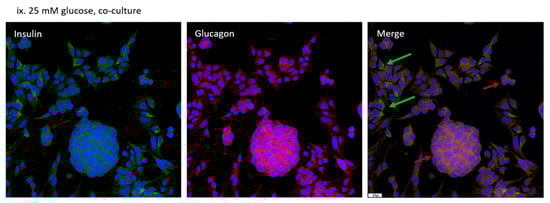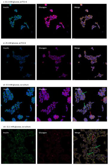 Cell morphology images of mono MIN-6 cells, mono α-TC1-6 cells, and co-cultured cells are shown in Figure S1. After 72 h of exposure to 25 mM glucose, no obvious aggregates were formed in co-cultured cells compared to mono-cultured cells. In immunostainings, MIN-6 cells displayed mainly staining against insulin (green), together with detectable signals of glucagon (pink) in all three incubation conditions. Independently cultured α-TC1-6 cells presented only glucagon staining and co-cultured cells denoted both. In the co-culture system, α and β cells exhibited no specific distribution patterns or islet-like aggregates although clusters of α cells were found. Concurrently, signals of direct α–β contact were detected (see Figure 3).