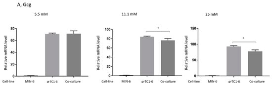 Pancreatic α cells secrete glucagon-related peptides such as glucagon, glucagon-like peptide-1 (GLP-1), and gastric inhibitory polypeptide. These peptides are critical for normal GSIS []. However, the recent results show that the presence of glucagon-secreting α-TC1-6 cells does not affect insulin secretion from MIN-6 cells when co-cultured in the ratio of 1:3; even a gentle decrease was seen in the 5.5 mM condition. This confirms the theory that α cells do not regulate insulin secretion through direct cell–cell contact. Insulin genes in mice comprise a two-gene system, preproinsulin 1 (Ins1) and preproinsulin 2 (Ins2). The two functional insulin genes code for exactly the same protein product. Gene expression of Ins1 was not altered in co-culture conditions (Figure 4F), which corroborates our findings in insulin secretion. For the gene expression of Ins2 (Figure 4G), only the co-cultured cells in 25 mM glucose experienced a minor elevation, which may, however, not be detectable at the protein level as no difference was shown in insulin release.