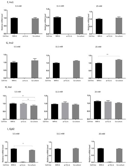 The gene expression of Insr slightly decreased in the co-culture condition as compared to both MIN-6 and α-TC1-6 cells, though it only became significant after incubation in 5.5 mM glucose (Figure 4H). Likewise, after co-incubation with α-TC1-6 cells for 72 h, connexin 36 (Gjd2) and Pancreatic and duodenal homeobox 1 (Pdx) expressed by MIN-6 were barely changed, except for a slight drop in cells grown in 5.5 mM glucose for both genes (p < 0.05), as revealed in Figure 4I,J. Lastly, Beta2/Neurod1, Akt1, N-CAM, PCSK2, PLCxd3, and Sirt 1 were expressed by both MIN-6 and α-TC1-6 cells (data not shown). Figure 4B–J are shown in Figure S2.