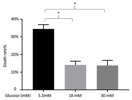 Effects on cell death rate of α-TC1-6 cells after 72 h incubation in 5.5, 18, or 30 mM glucose. Data are presented as the mean ± SEM of 24 samples per condition from three independent experiments. * p < 0.05.