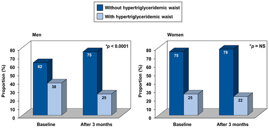 Figure 2 presents changes in the proportion of hyperTG waist [30,31] in response to the workplace intervention program. Although the proportion of the hyperTG waist phenotype decreased in both sexes, the reduction only reached significance in men (p < 0.0001). In addition, relative changes in TG levels were significantly correlated with relative changes in waist circumference (r = 0.29, p < 0.0001, for both men and women).