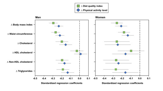 Standardized regression coefficients (with 95% confidence intervals) for the association between changes in diet quality index or physical activity level and changes in cardiometabolic risk markers in men and women. Models are adjusted for medication use (lipids, hypertension, and diabetes) and menopausal status in women. HDL: high-density lipoprotein; NHDL: non-HDL cholesterol.