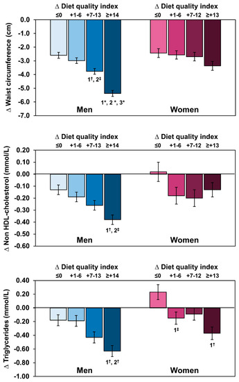 Changes in waist circumference, non-HDL cholesterol, and triglycerides according to quartiles of changes in diet quality index in response to the 3-month lifestyle modification program. Data represent least-squares means ± standard error to the mean adjusted for the baseline diet quality index. ‡ p < 0.05; † p < 0.001; * p < 0.0001.