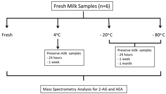 Schematic for milk sample collection, storage conditions and analysis. Fresh milk samples were collected and analyzed for 2-AG and AEA. The samples were aliquoted and stored under different conditions to determine how temperature (4 °C, −20 °C and −80 °C) and length of time (24 h, 1week and 1 month) affects endocannabinoid concentrations.