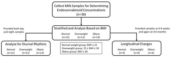 In our subsequent study, milk samples were collected from breastfeeding mothers and stratified into 3 groups based on their BMI calculated at the time of the study. They were termed as normal weight group (BMI ≤ 25) [n = 12], overweight group (25 ≤ BMI ≤ 30) [n = 11] and obese group (BMI ≥ 30) [n = 13] according to Centers for Disease Control guidelines [17]. Milk samples were collected during regular feeding times for 24 h and analyzed for AEA and 2-AG concentration for each group. To determine the effect of diurnal rhythm, collected milk samples were divided into day samples (6 am–10 pm) and night samples (11 pm–5 am) and analyzed. One participant in the normal BMI group was excluded since she did not provide any night samples. For the longitudinal study, women provided milk samples over a 24-h period again at 4–6 months for analysis. Due to a high attrition rate during the study, we only analyzed 4 women for each of the 3 BMI groups.