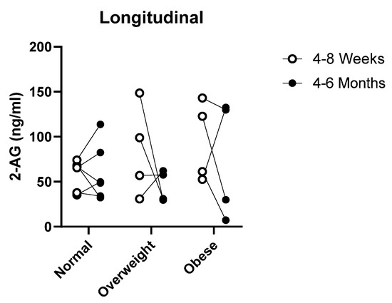 Longitudinal follow up was done 4–6 months postpartum after the initial collection of 4–6 weeks postpartum in order to determine any difference in the 2-AG levels overtime. Unfortunately, there was a high attrition rate due to the length of time between collection points for this part of the study, with only 14 out of 36 women contributing milk samples. No significant difference was observed for the average 2-AG levels overtime for the three groups (Figure 6). However, the average 2-AG concentrations in milk tended to decrease over time for the overweight and obese group, whereas the normal group remained consistent.