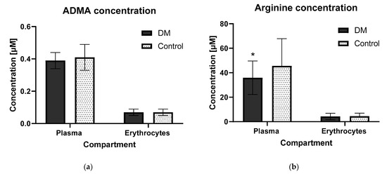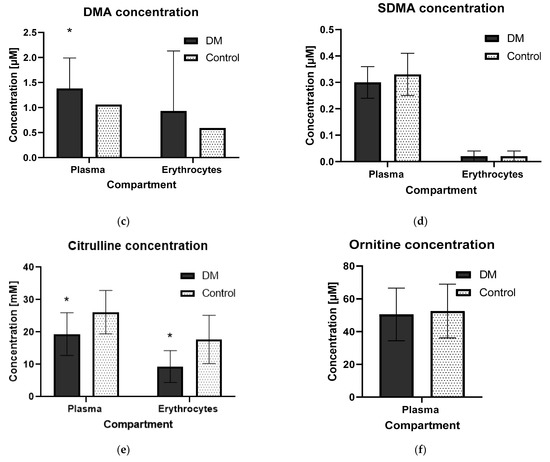 Three of the six evaluated metabolites of the nitric oxide pathway were found to be significantly different in the plasma compartment (Arginine, DMA, citrulline). One was found to be altered in the erythrocytes (citrulline), when compared to the control group. The citrulline level was decreased in both compartments among DM patients, which was more noticeable in the erythrocytes. Simultaneously, the Arginine level was reduced in plasma, with no differences in the erythrocyte levels between groups. On the contrary, the dimethylamine (DMA) concentration was increased in plasma which was consecutively not observed in red blood cells (RBCs). All of the alterated nitric oxide metabolites were found at higher concentrations in plasma in both groups.