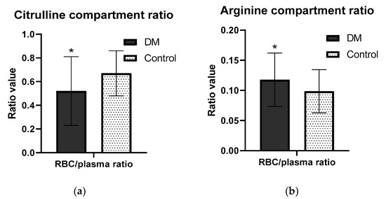 Additionally, enhanced Arginine transport from plasma to erythrocytes were found as Arginine compartment ratios were significantly different. Increased transport via system y+ in human erythrocytes had already been confirmed in different diseases affecting nitric oxide transformation, such as renal failure and chronic heart diseases [25,26]. It may indicate that the same upregulation of y+ transport occurred in the DM group as a compensatory response to maintain the NO production.