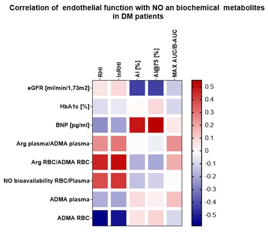 Correlation of endothelial function with NO and biochemical metabolites in DM patients. Abbreviations: RHI: reactive hyperaemia index (EndoPAT 2000); AI (%): augmentation index (EndoPAT 2000), AI-75 (%): augmentation index normalized for a heart rate of 75 beats/min (EndoPAT 2000), MHI: maximum hyperaemia index (Laser Doppler Flowmetry); RBC: red blood cells; eGFR: estimated glomerular filtration rate; BNP: brain natriuretic peptide; ADMA: Asymmetric dimethylarginine; Arg: L-Arginine.
