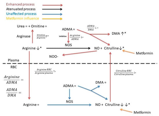 - Bestermann, W.H. The ADMA-Metformin Hypothesis: Linking the Cardiovascular Consequences of the Metabolic Syndrome and Type 2 Diabetes. Cardiorenal Med. 2011, 1, 211–219. [Google Scholar] [CrossRef]