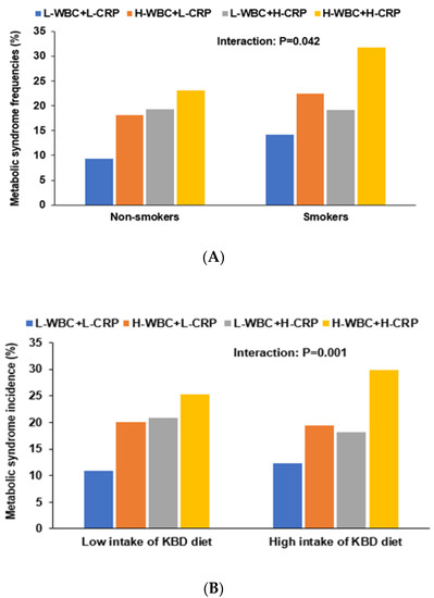Interaction between immunity and lifestyles, including diets, was assessed for MetS risk using two-way ANCOVA with main effects (immunity status and nutrients) and their interaction term after adjusting for covariates (Table 5). The participants with regular physical activity had lower immunity (Table 1), and physical activity was negatively associated with immunity, but they did not interact to influence MetS risk (p = 0.650; Table 5). The overall incidence of MetS was lower in the non-smokers compared to the smokers (Table 1). Current smoking had a positive association with immunity, and it had an interaction with immunity to influence MetS risk (p = 0.042; Table 5). In non-smokers, MetS risk was positively associated with the H-WBC+L-CRP group by 1.86-fold compared to the L-WBC+L-CRP, whereas in smokers, MetS risk was positively associated with the H-WBC+H-CRP group by 2.35-fold compared to the L-WBC+L-CRP (Table 5). The incidence of MetS was much higher in the H-WBC+H-CRP than the L-WBC+L-CRP in smokers (Figure 2A).