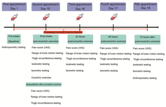 Prior to the commencement of the eccentric exercise protocol, participants consumed 4 capsules of CB (crocodile blood powder: 250 mg/ capsule; Sriracha Moda Co., Ltd., Thailand) or placebo (fructose: 250 mg/capsule; Sriracha Moda Co., Ltd., Thailand) every day (twice a day: after breakfast (at 8.00 a.m.) and after dinner (at 6.00 p.m.)) for 18 days. The CB and placebo capsules were the same color to ensure that the participants and researchers were blinded to the type of capsule consumed. Eleven days after the initial visit to the laboratory, a 24 h dietary recall via structured interview was performed, with participants asked to recall all food and drinks consumed in the previous 24 h. This dietary recall was repeated over the following 7-day period (days 11 to 17), and each participants’ average calorie intake was calculated. On the second visit to the laboratory (day 15), the participants were asked to complete an eccentric exercise protocol on an isokinetic dynamometer. Visual analogue pain scores (VAS), range of knee motion (ROM), thigh circumference, maximal voluntary contraction (MVC) and maximal voluntary isometric contraction (MVIC) strength, anthropometric measures (body mass and BMI), and blood inflammatory and biochemical markers were evaluated at pre-determined time-points (Figure 1).