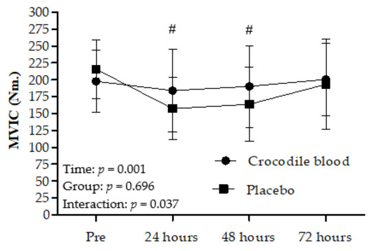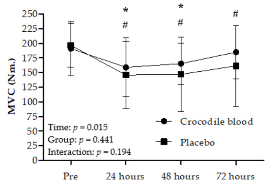 Maximum voluntary contraction (MVC) peak torque before eccentric exercise (Pre) and 24 h, 48 h, and 72 h after eccentric exercise. (mean ± 95% CI). Data were analyzed using a two-way repeated-measures ANOVA with post hoc Fisher’s Least Significant Difference (LSD) in comparison to pre-eccentric exercise values. # = Significant difference in the placebo group in comparison to pre-eccentric exercise values (p < 0.05) * = Significant difference in the crocodile blood group in comparison to pre-eccentric exercise values (p < 0.05).