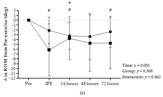For knee ROM, there was no significant difference between groups (p = 0.368) and interaction effects (p = 0.462). However, knee ROM showed a significant time effect (p = 0.001). Knee ROM in the CB group showed a significant difference 24 h (p = 0.013) post-eccentric exercise compared to pre-eccentric exercise values. Also, Knee ROM in the PL group showed a dramatical difference immediately (p = 0.015), 24 h (p = 0.048), and 72 h (p = 0.038) after eccentric exercise (Figure 4c).
