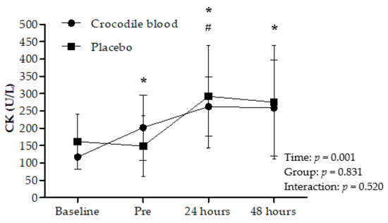 The absolute values of creatine kinase (CK) at baseline (before supplementation intake), before eccentric exercise (Pre) and 24 h and 48 h after supplementation intake (mean ± 95% CI). Data were analyzed using a two-way repeated-measures ANOVA with post hoc Fisher’s Least Significant Difference (LSD) in comparison to from baseline values. # = Significant difference in the placebo group compared to baseline values (p < 0.05) * = Significant difference in the crocodile blood group compared to baseline values (p < 0.05).