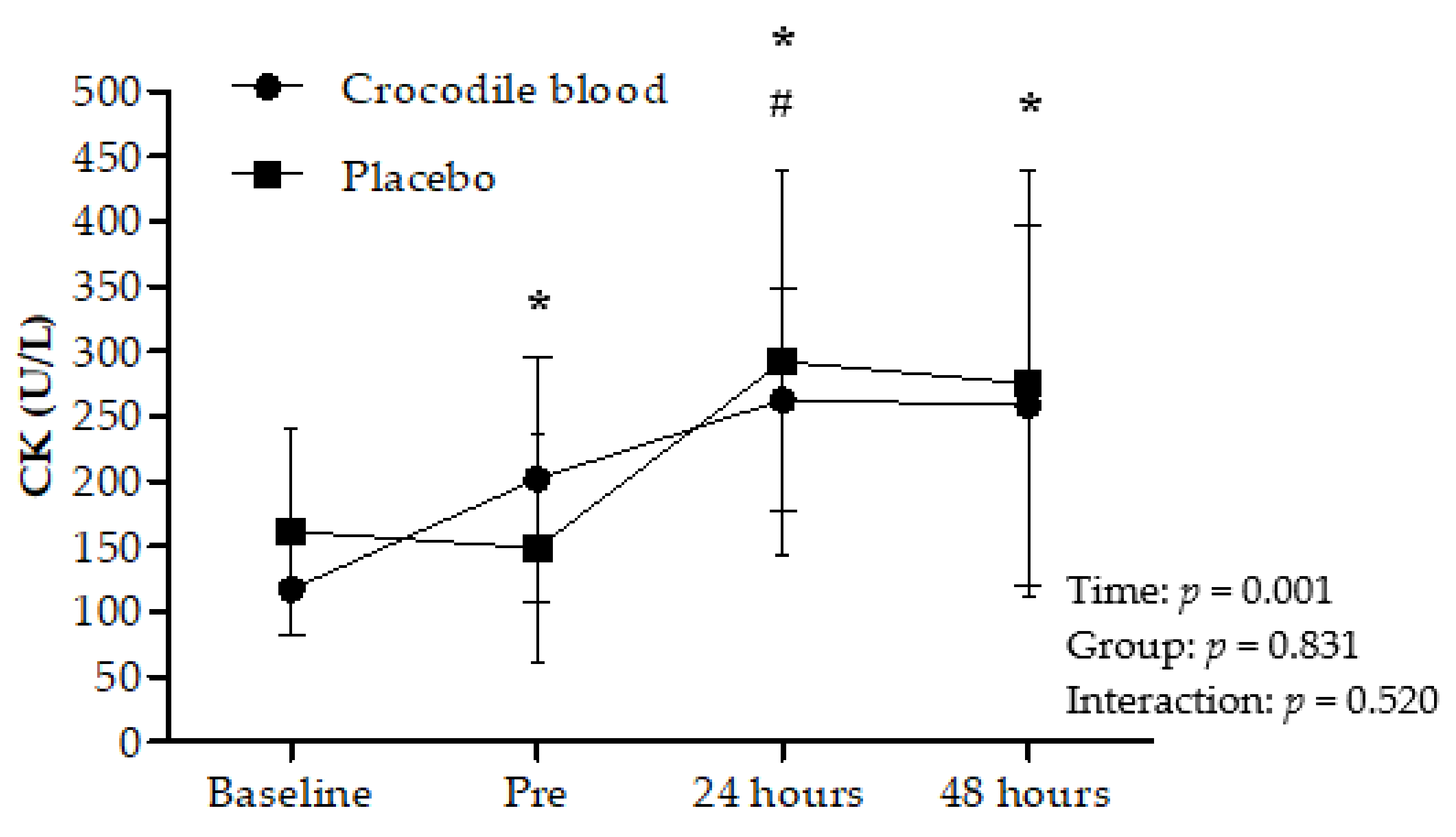 Paratthakonkun, C.; Vimuttipong, V.; Nana, A.; Chaijenkij, K.; Soonthornworasiri, N.; Arthan, D. The Effects of Crocodile Blood Supplementation on Delayed-Onset Muscle Soreness. Nutrients 2021, 13, 2312. https://doi.org/10.3390/nu13072312