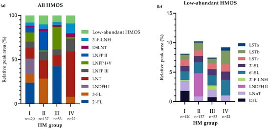 Median relative peak areas (rPA) of all selected human milk oligosaccharides (HMOS) (a) and of the subset of low-abundant HMOS (b) in the human milk (HM) samples (n = 635) collected in the first 4 months of lactation according to the HM groups [4,11,15]. Three samples could not be assigned to a HM group and are, for this reason, not depicted in these figures.