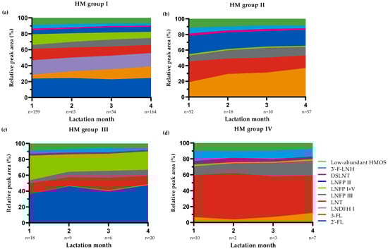Median relative peak areas (rPA) of all selected human milk oligosaccharides (HMOS) in the human milk (HM) samples (n = 635) collected in the first 4 months of lactation according to HM group [4,11,15] and lactation stage. (a) HM group I; (b): HM group II; (c): HM group III and (d): HM group IV. Three samples could not be assigned to a HM group and are for this reason not depicted in these figures.