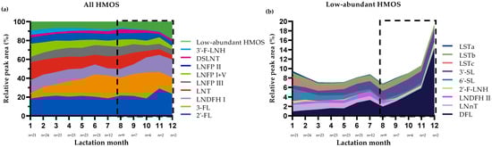 Median relative peak areas (rPA) of all selected human milk oligosaccharides (HMOS) (a) and of the subset of low-abundant HMOS (b) in the human milk (HM) samples (n = 171, Dutch subset) collected in the first year postpartum according to lactation month. Symbols used: