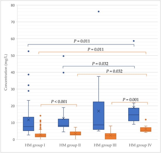 Absolute concentrations of β3′-GL were higher in HM samples assigned to HM group IV (5.48 mg/L) compared to samples assigned to HM group I (2.12 mg/L), HM group II (3.16 mg/L) and HM group III (2.21 mg/L) (p < 0.05 for all). Additionally, samples of HM group II had higher absolute concentrations of β3′-GL compared to samples of HM group I (p < 0.001) (Figure 5).