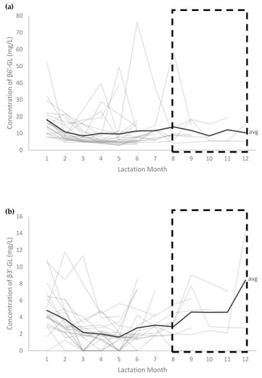 The absolute concentration of β6′-GL was also higher in samples assigned to HM group IV (14.7 mg/L) compared to HM groups I (7.62 mg/L) and II (8.30 mg/L) (p < 0.05 for all) (Figure 5). Absolute levels of β3’-GL and β6’-GL remained stable over lactation stages (Figure 6).