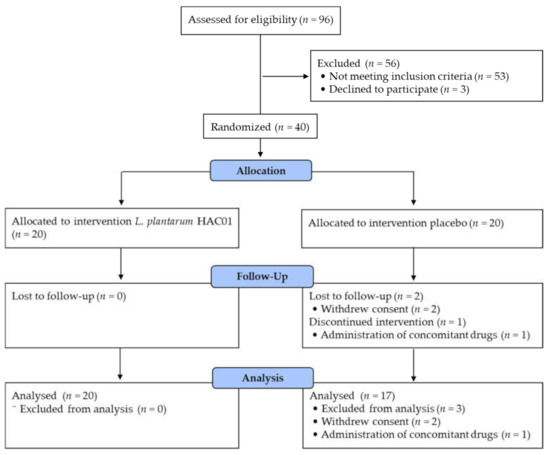 | Placebo (n = 20) | L. plantarum HAC01 (n = 20) | p-Value | |