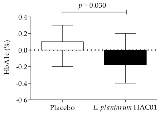 APA StyleOh, M.-R., Jang, H.-Y., Lee, S.-Y., Jung, S.-J., Chae, S.-W., Lee, S.-O., & Park, B.-H. (2021). Lactobacillus plantarum HAC01 Supplementation Improves Glycemic Control in Prediabetic Subjects: A Randomized, Double-Blind, Placebo-Controlled Trial. Nutrients, 13(7), 2337. https://doi.org/10.3390/nu13072337