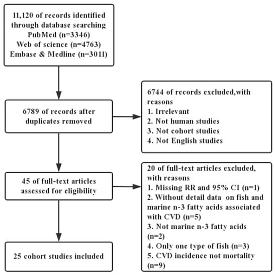 Two project members (L.J. and B.Z.) independently screened all titles and abstracts of the retrieved studies. Disagreements regarding the inclusion of the studies and the interpretation of the data were resolved by discussion among investigators. The studies were included in this meta-analysis if they met the following criteria: (1) study design: prospective cohort studies; (2) exposure: fish and marine n-3 PUFA; (3) source of n-3 PUFA: marine-derived n-3 PUFA (DHA, DPA, and EPA); and (4) outcomes: total CVD mortality which was reported as multivariate-adjusted relative risk (RR) and 95% confidence intervals (CI). The studies were excluded with the following criteria: (1) irrelevant; (2) not human studies; (3) not cohort studies; (4) not English studies.