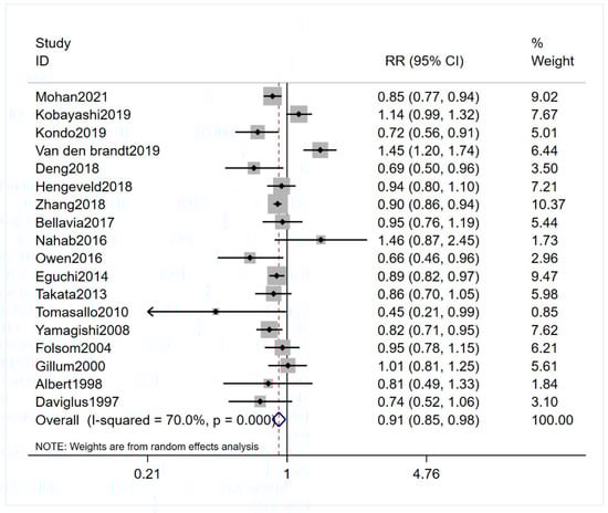 Eighteen studies, involving 1,267,951 participants and 51,628 CVD deaths, investigated the association between the fish intake and the CVD mortality risk [13,14,15,16,17,18,23,24,25,26,27,28,29,30,31,32,33,40]. The pooled RR (95% CI) was 0.91 (0.85–0.98) for the highest versus the lowest fish consumption category (I2 = 70.0%) (Figure 2). Sensitivity analysis did not change the protective effects of fish on CVD mortality (Figure S1). Subgroup analysis suggested that there was a significant negative association between the fish intake and the CVD mortality risk among the subgroups with nine years or more follow-up duration (Table 3). No publication bias was found (Egger’s test: p = 0.919; funnel plot: Figure S2).
