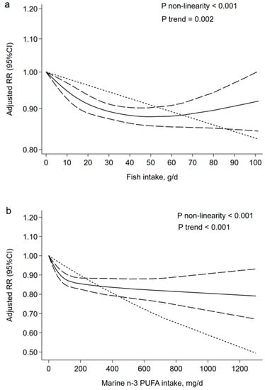 Dose-response association: (a) fish and CVD mortality (n = 10, p non-linearity < 0.001; p trend = 0.002); the risk of CVD mortality was decreased by 4% with an increase of 20 g of fish intake (RR = 0.96; 95% CI: 0.94–0.99) per day. (b) marine n-3 PUFA and CVD mortality (n = 8, p non-linearity < 0.001; p trend < 0.001); the risk of CVD mortality was decreased by 4% with an increase of 80 milligrams of marine n-3 PUFA intake (RR = 0.96; 95% CI: 0.94–0.98) per day. CVD, cardiovascular disease; n-3 PUFA, n-3 polyunsaturated fatty acids; RR, relevant risk; CI, confidence intervals; g/d, grams per day; mg/d, milligrams per day.