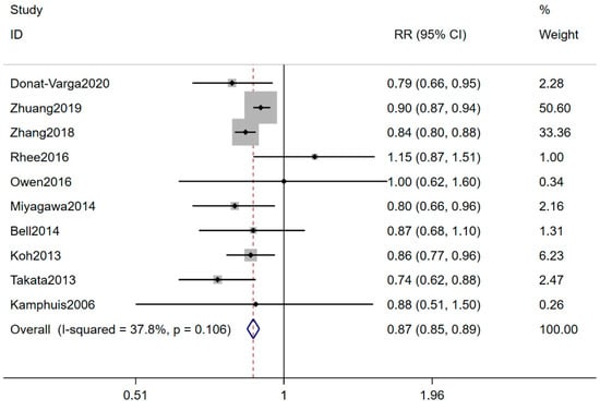 Ten eligible studies with 1,337,660 participants and 76,537 CVD deaths explored the association of marine n-3 PUFA intake with CVD mortality risk [11,18,25,27,34,35,36,37,38,39]. The pooled RR (95% CI) for the highest versus the lowest marine n-3 PUFA consumption category was 0.87 (0.85–0.89), with a low heterogeneity (I2 = 37.8%) (Figure 4). Sensitivity analysis suggested a great impact on one article with high quality (Figure S3) [35]. The negative association between marine n-3 PUFA and the risk of CVD mortality was altered from 0.87 (0.85–0.89) to 0.84 (0.81–0.87) by deleting this study. Subgroup analyses displayed a significant negative association among the Americas, and Asian and European countries compared with Oceania countries (Table 3). No publication bias was found (Egger’s test: p = 0.722; funnel plot: Figure S4). Figure 3b showed the linear and non-linear dose-response analysis between marine n-3 PUFA intake and CVD mortality risk. Eight prospective cohort studies met the requirements of dose-response analysis [18,25,27,34,36,37,38,39], and the curvilinear correlation presented a downward trend of CVD deaths with the increase of n-3 PUFA intake (p non-linearity < 0.001). Linear dose-response analysis suggested that an increase of 80 milligrams of n-3 PUFA per day was associated with a 4% lower risk of CVD mortality (95% CI: 0.94–0.98; p trend < 0.001).