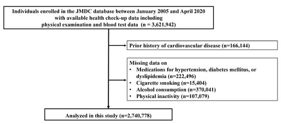 We conducted this retrospective observational study using the JMDC Claims Database between January 2005 and April 2020 [18,19,20,21,22,23]. The JMDC Claims Database includes the health insurance claims data from more than 60 insurers. The majority of insured individuals enrolled in the JMDC Claims Database are employees of relatively large companies. The JMDC Claims Database includes the individuals’ health check-up data, including demographics, prior medical history, medication status, and hospital claims recorded using the International Classification of Diseases, 10th Revision (ICD-10) coding. JMDC which is a healthcare venture company, collected the data on health check-up and clinical outcome such as diagnosis of stroke using ICD-10 code from insurer or medical institutes regularly, and assembled a database. We extracted 3,621,942 individuals with available health check-up data on BMI (12.5–60 kg/m2), blood pressure, and blood test results at health check-up from the JMDC Claims Database between January 2005 and April 2020. Subsequently, we excluded the individuals with a history of myocardial infarction, angina pectoris, stroke, heart failure, and atrial fibrillation or hemodialysis (n = 166,144), and those with missing data on medications for hypertension, diabetes mellitus, or dyslipidemia (n = 222,496), cigarette smoking (n = 15,404), alcohol consumption (n = 370,041), and physical inactivity (n = 107,079). Finally, 2,740,778 participants were included in this study (Figure 1).