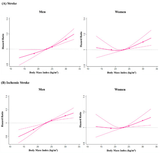 Stroke is a major cause of death and disability [1,2,3]. In the United States, the annual incidence of stroke is approximately 795,000, of which approximately 610,000 are first-ever stroke events, and 185,000 are recurrent stroke events [1]. In the European countries, there were 2.3 million new cases diagnosed with stroke and 20.4 million people living with stroke in 2017 [4]. Obesity is an important risk factor for cardiovascular disease (CVD) [5,6,7,8,9] and is reported to be associated with a greater incidence of stroke [10,11,12]. Conversely, underweight is also associated with a higher risk of several CVDs and adverse clinical outcomes [13,14,15]. However, the data on the risk of underweight with incident stroke are scarce. Moreover, stroke can be categorized into two types, ischemic stroke, and hemorrhagic stroke; additionally, the pathology of these two subtypes should be separately discussed. For example, several studies have shown that body mass index (BMI) could influence the risk of ischemic or hemorrhagic stroke differently [16,17]. However, the association of wide-range BMI (including both obesity and underweight) with incident ischemic or hemorrhagic stroke has not been fully elucidated [10,11,12,16,17]. Furthermore, the distribution of BMI is different between men and women; therefore, the relationship between BMI and the risk of stroke could differ by sex [10,12]. In this study, we sought to examine the relationship between BMI and incident ischemic or hemorrhagic stroke stratified by sex using a nationwide epidemiological database.