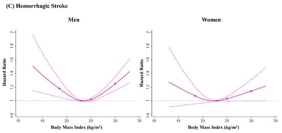 Figure 2 shows the dose–response relationship between BMI and the risk of incident stroke. The association between BMI and the incidence of stroke was modeled using multivariable-adjusted spline regression models with a reference point set at BMI of 23 kg/m2. A linear dose–response relationship was observed between BMI and the risk of total stroke in men (Figure 2A). In women, RCS showed that the risk of total stroke was lowest at around 20 kg/m2 and increased in a dose-dependent manner after the BMI exceeded 20 kg/m2 (Figure 2A). There was a linear dose–response relationship between BMI and the risk of ischemic stroke in men (Figure 2B). In women, RCS showed that the incidence of ischemic stroke was lowest at around 20 kg/m2 and increased linearly after BMI exceeded approximately 20 kg/m2 (Figure 2B). There was a U-shaped relationship between BMI and the risk of hemorrhagic stroke with the bottoms of splines around 23–24 kg/m2 in men (Figure 2C). A dose-dependent association between BMI and the risk of hemorrhagic stroke was not evident in women (Figure 2C).