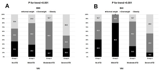 The distribution of BMI-defined (A) and BAI-defined (B) weight categories in respective adipose tissue dysfunction (ATD) types defined by VAI.
